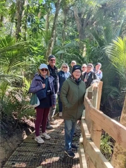 An enthusiastic group of Bird Watchers (and listeners) were not disappointed with our visit to Tawharanui to listen to bird song. The noisiest were the bellbirds korimako although the tui gave them a run for their money! Whiteheads popo kotea, saddlebacks tieke, banded rail moho pereru, (who were more interested in foraging than singing), kereru, whose flight makes a whooshing sound, and a baby takahe honking for its parents, piwakawaka all put on a show, many daring to come on the same eco trail as us. The baby takahe is considered to be the first born in a public place in NZ. For those interested in enjoying such an experience, make sure you go early (before 9.30 am) and walk slowly through the ngahere.